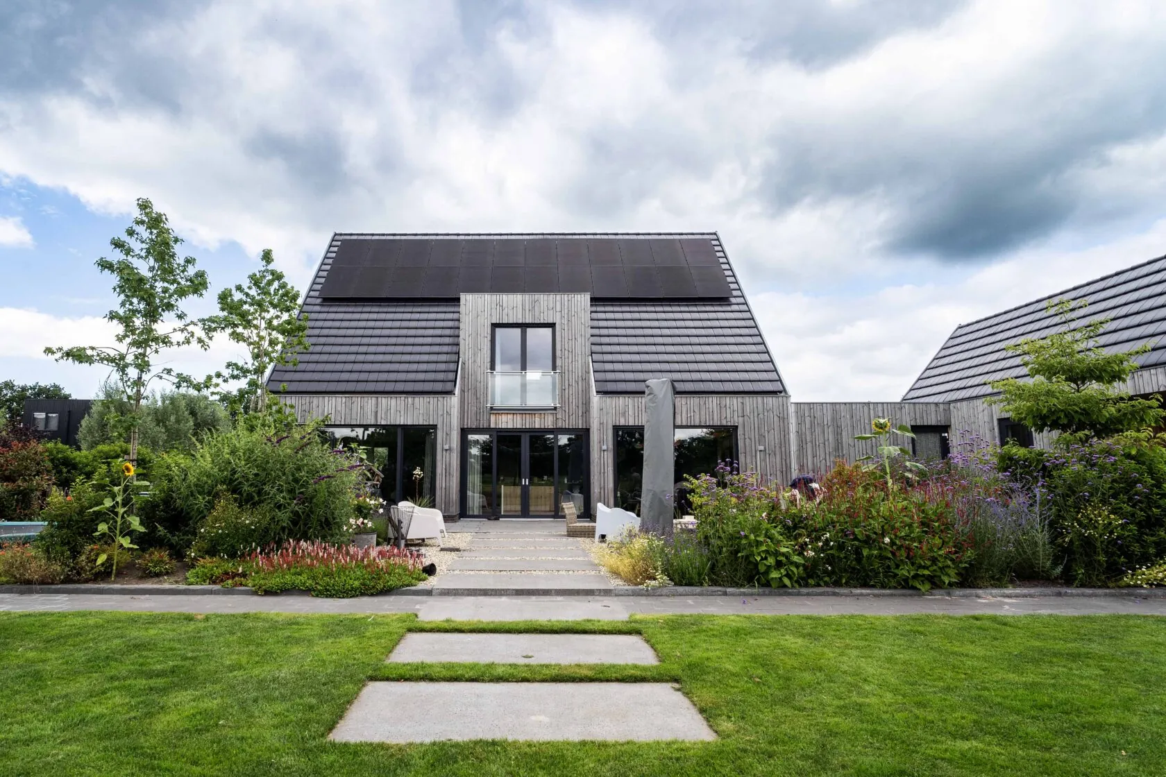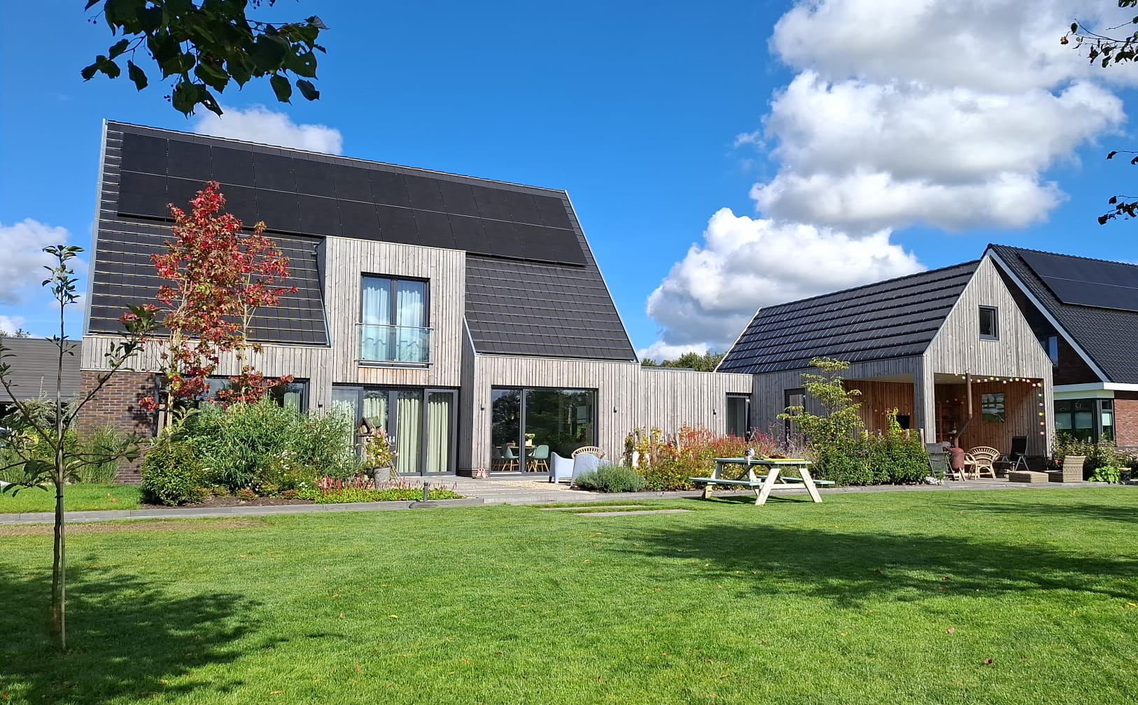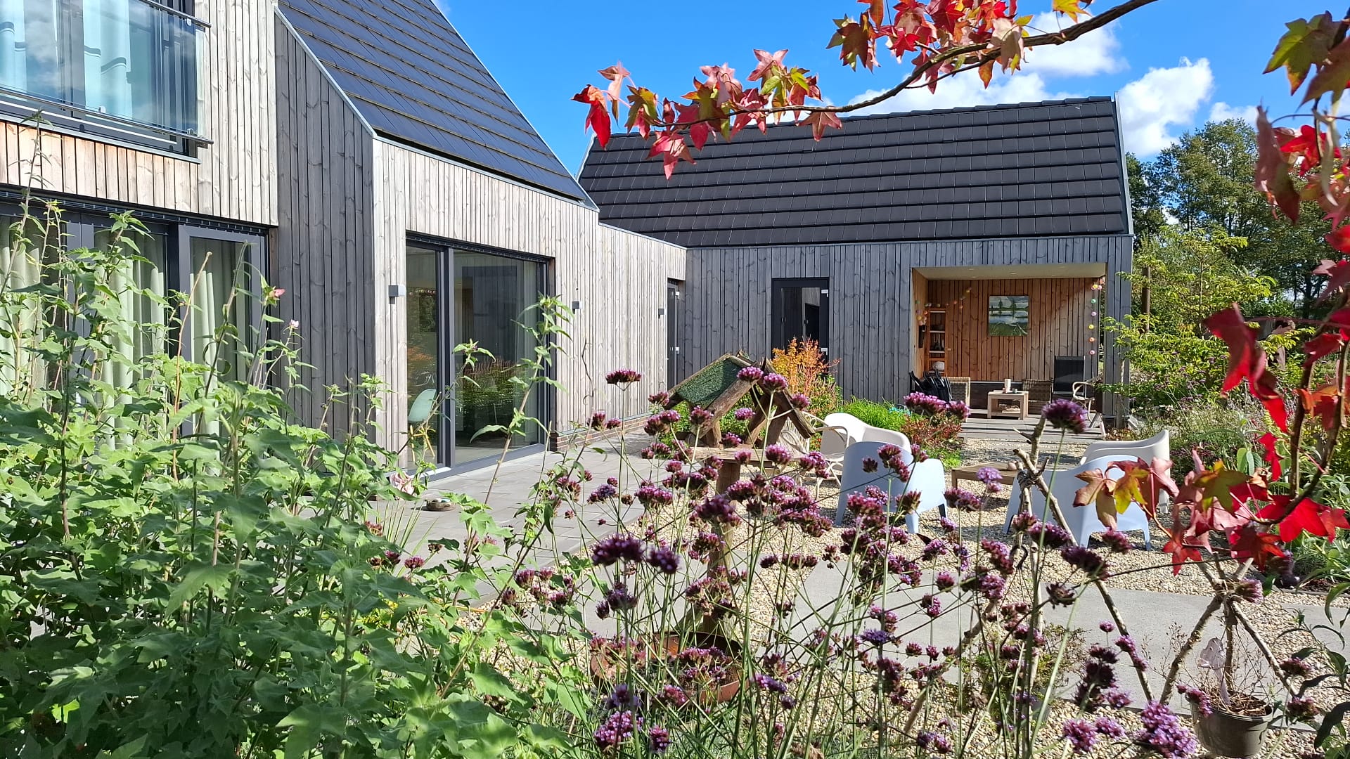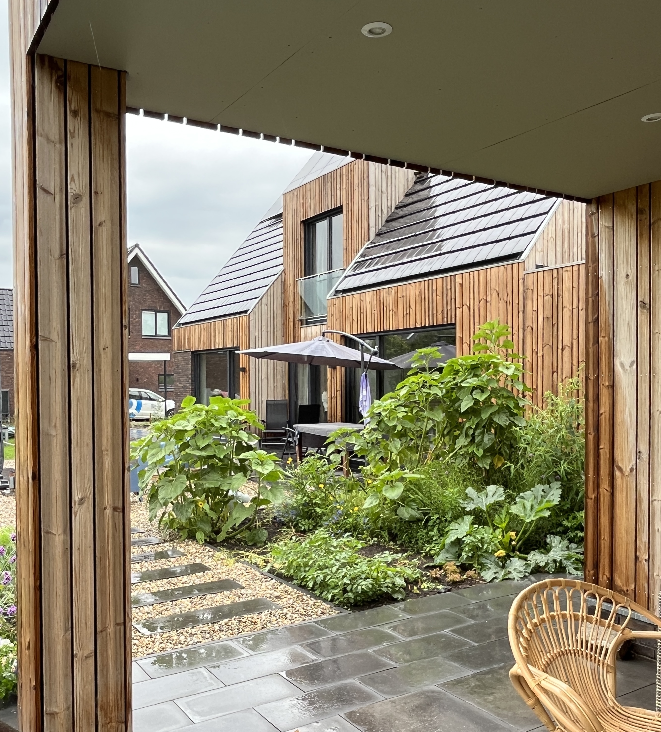 Door de plaatsing van de schuur en berging aan de zijkant te ontstaat er veel privacy en verschillende plekken in de tuin.