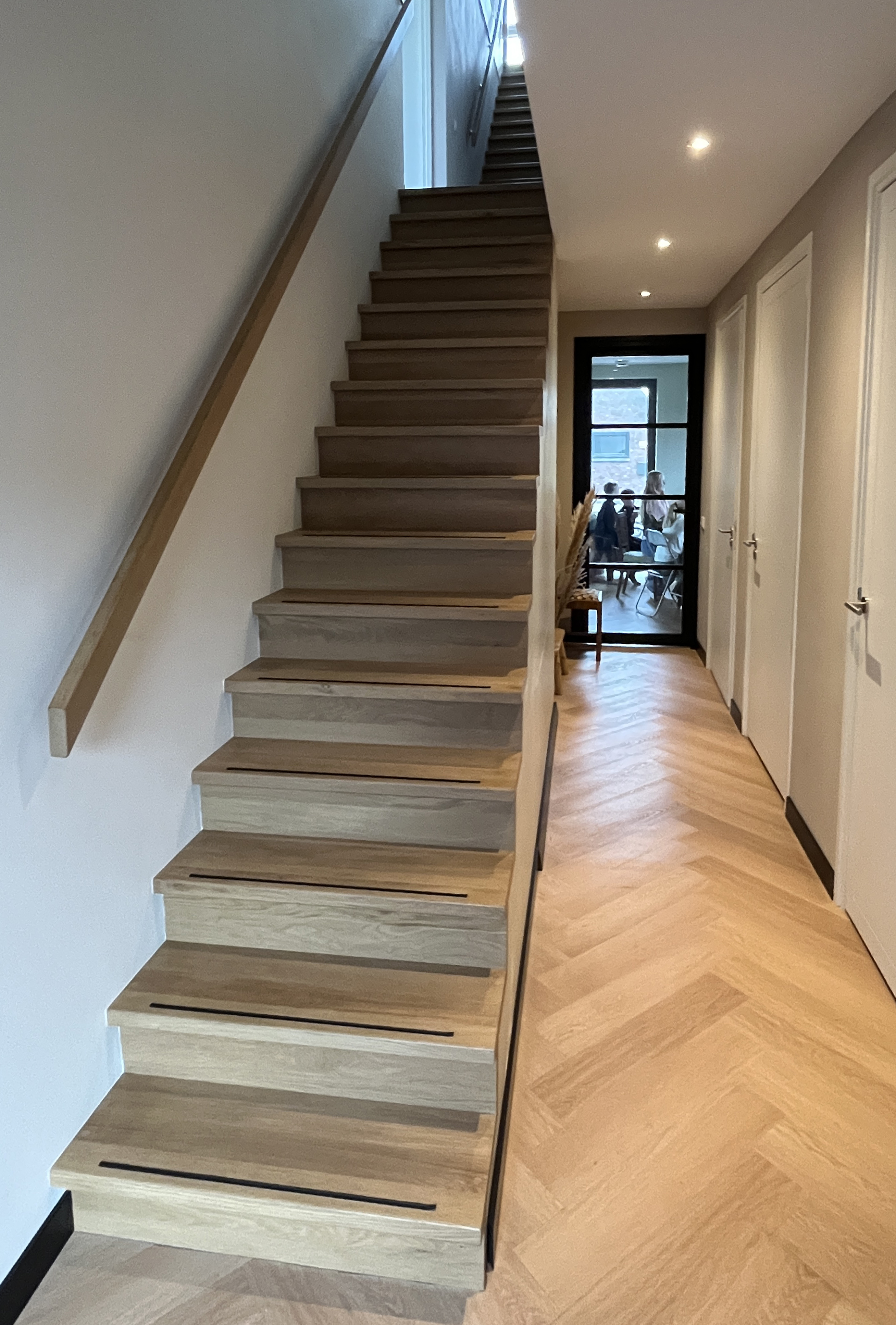 De trap loopt in de langsrichting mee naar het licht boven in de kap.