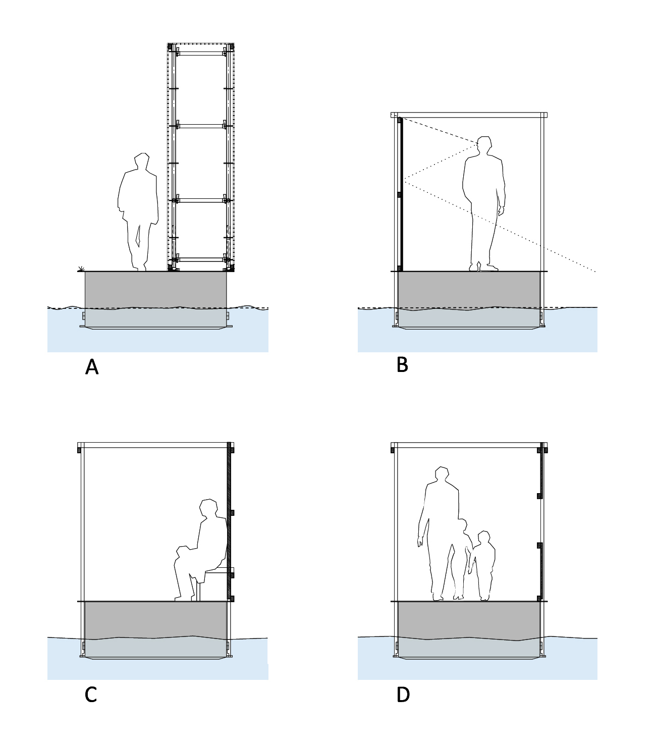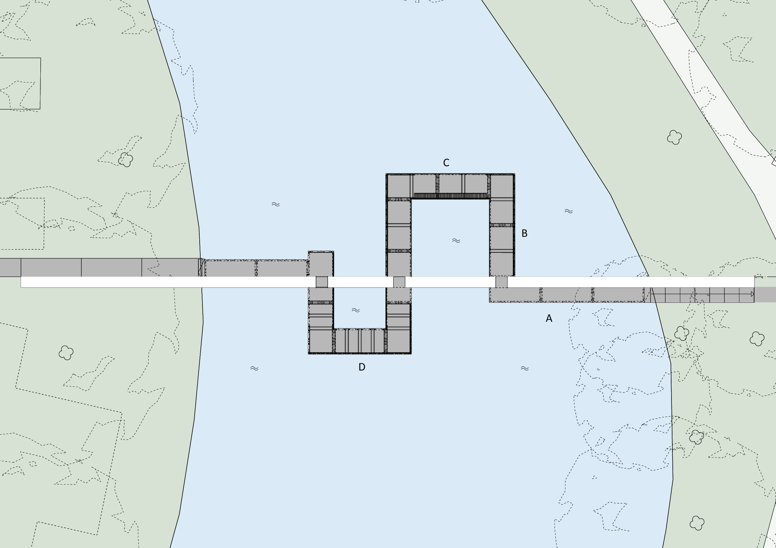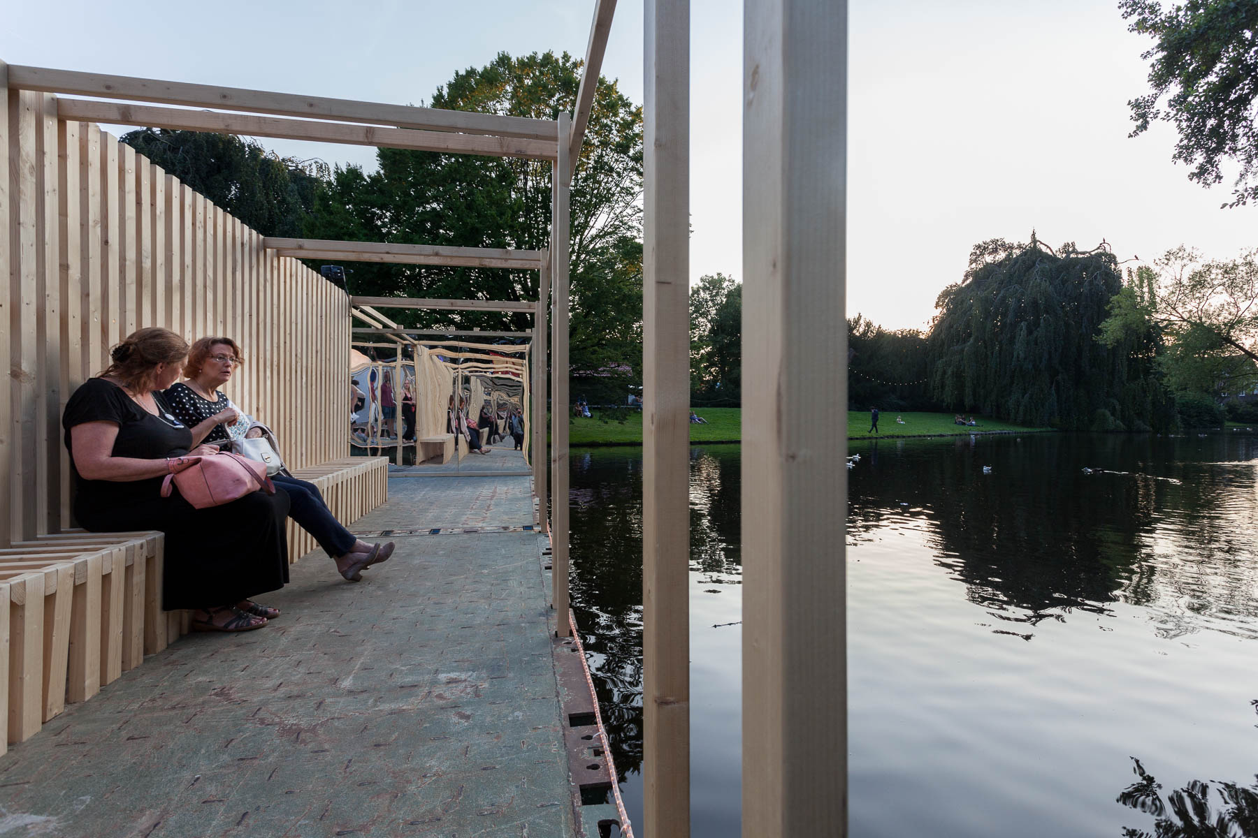 Een houten route slingert door de muur en maakt ruimtes en plekken, verschillende scene’s ontstaan onderweg en de route geeft eenander perspectief op het park.